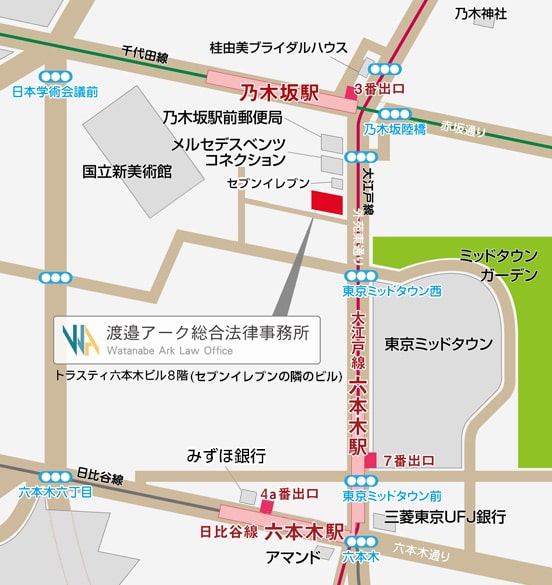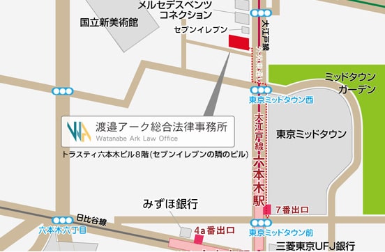 ⑧ 2つめの横断歩道を渡って右に30Mほど進むと、1階にセブンイレブンが入っているビルがあります。このビルの手前のビル(トラスティ六本木ビル)の8階が当事務所です。 |