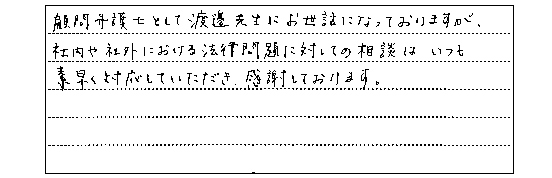 顧問弁護士として渡邉先生にお世話になっておりますが、社内や社外における法律問題に対しての相談はいつも素早く対応していただき、感謝しております。