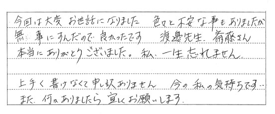 今回は大変お世話になりました。色々と不安な事もありましたが無事にすんだので良かったです。渡邉先生、斎藤さん本当にありがとうございました。私、一生忘れません。