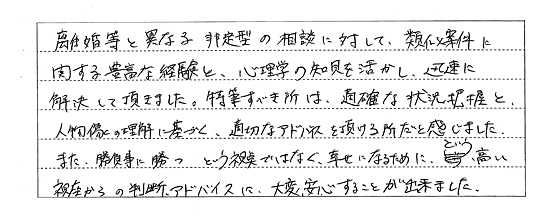 離婚等と異なる非定型の相談に対して、類似案件に関する豊富な経験と、心理学の知見を活かし、迅速に解決して頂きました。特筆すべき所は、適確な状況把握と、人物像の理解に基づく、適切なアドバイスを頂ける所だと感じました。また、勝負事に勝つという視点ではなく、幸せになるために、という高い視座からの判断、アドバイスに、大変、安心することが出来ました。