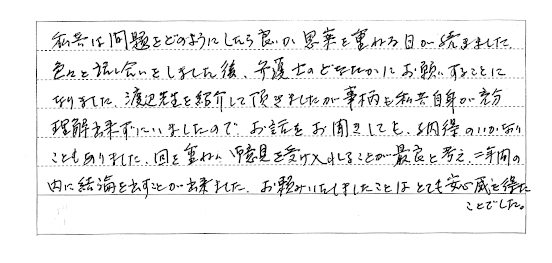 私共は問題をどのようにしたら良いか思案を重ねる日が続きました。色々と話し合いをしました後、弁護士のどなたかにお願いすることになりました。渡辺先生を紹介して頂きましたが事柄も私共自信が充分理解出来ずにいましたので、お話をお聞きしても、納得のいかないこともありました。回を重ね御意見を受け入れることが最良と考え、二年間の内に結論を出すことが出来ました。お頼みいたしましたことはとても安心感を得たことでした。