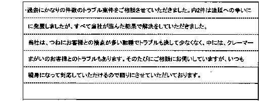 過去にかなりの件数のトラブル案件をご相談させていただきました。内2件は法廷への争いに発展しましたが、すべて当社が臨んだ結果で解決をしていただきました。