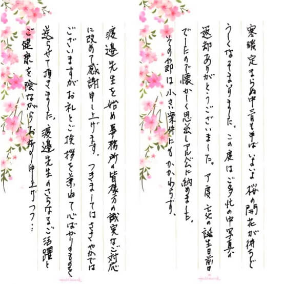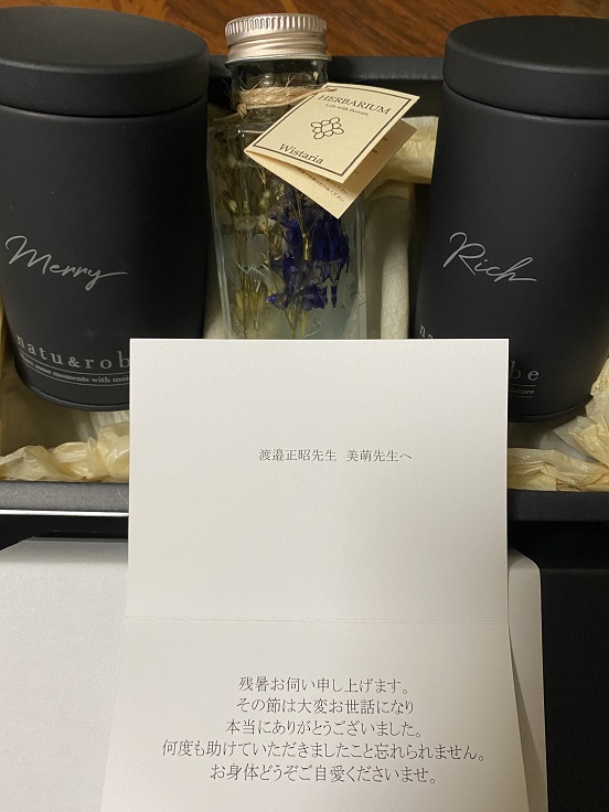 その節は小さい案件にもかかわらず、渡邉先生を始め事務所の皆様方の誠実なご対応に改めて感謝申し上げます。つきましてはささやかではございますがお礼とご挨拶を兼ねて心ばかりのものを送らせて頂きました。