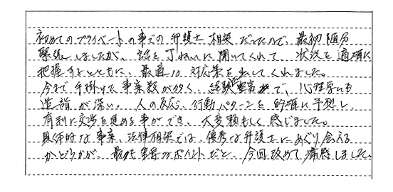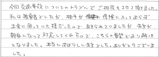 今回交通事故についてのトラブルでご相談をさせて頂きました。私は被害者でしたが、相手が保険に入っておらずお金に困っていた様だったので、あきらめていましたが先生が親身になって対応してくれたのでこちらの要望どおり解決となりました。