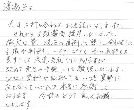 膨大な量、過去の事例に照らし合わせての主張や判例、一行・二行で私の気持ちを表すには大変失礼ではありますが改めて先生の手腕には敬服いたします。