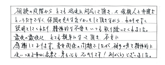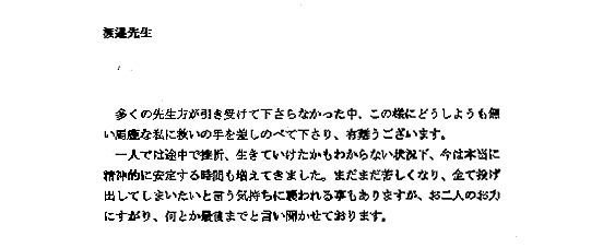 先生には、私の思いを丁寧に聞いていただき、また先方にお伝えいただいたり、心のこもった交渉をしていただき、本当に感謝いたしております。