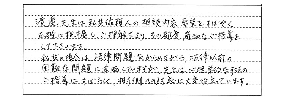 渡邉先生は私共依頼人の相談内容、要望をすばやく正確に把握し、ご理解下さり、その都度適切なご指導をして下さいます。